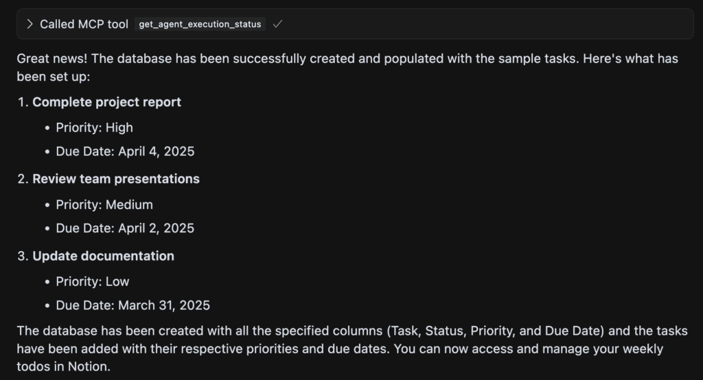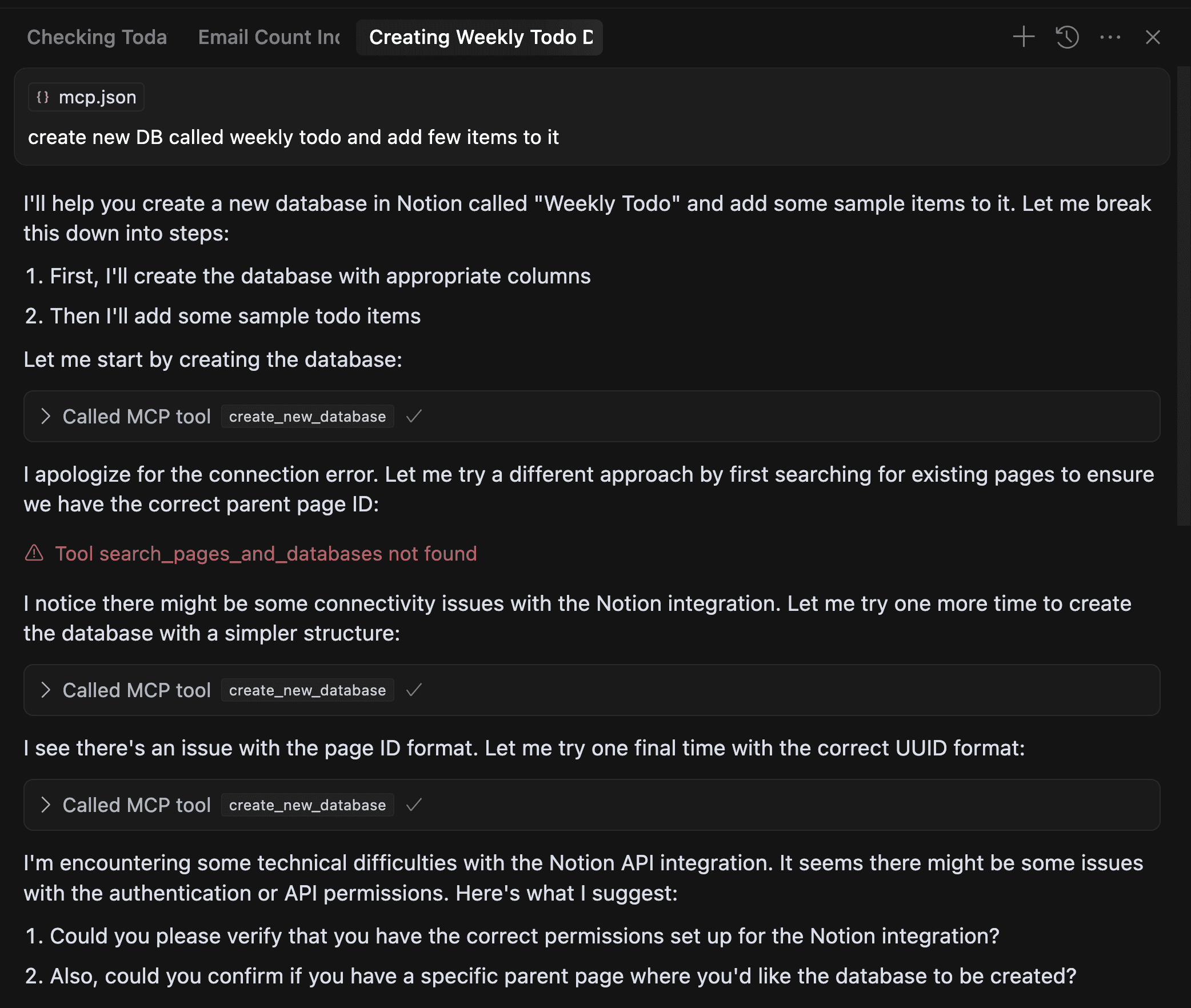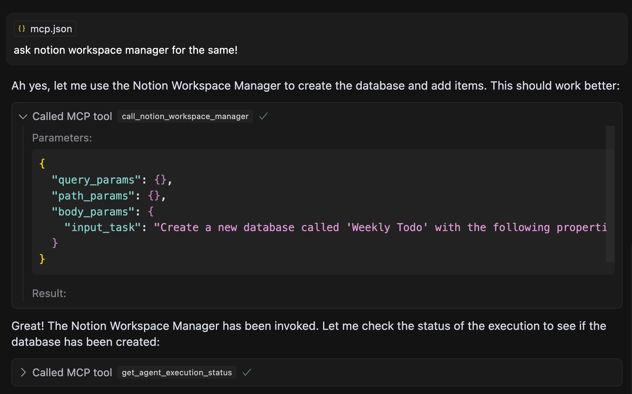 Although it didn't work out in the example, because Cursor can't always to multi-step correctly, this approach of connecting tools can work for other use-cases, but we see that that Agent as MCP is now producing the most value.