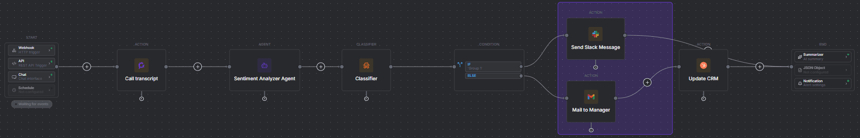 2. Workflow orchestration: The system orchestrates a multi-step workflow to transcribe the audio, summarize objections, and score sentiment.