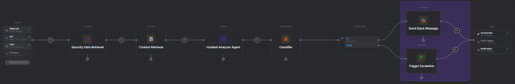 3. Incident analysis and Ccassification: The workflow triggers an AI agent that uses advanced frameworks to analyze the alert data, classify the incident severity, and select the optimal response playbook for automation.