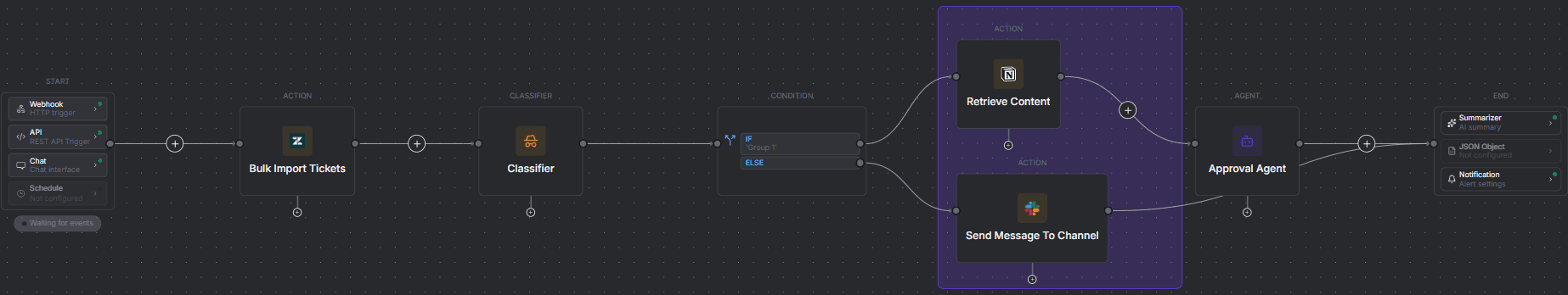 1. Ticket ingestion: The agentic workflow detects a new support request via integration with enterprise platforms like Zendesk, triggering the automation sequence.